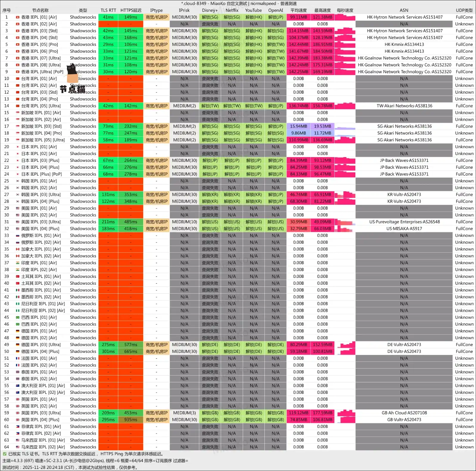 节点猫做的墙洞机场测评基于 Platinum 套餐,不包含 IEPL (Ultra/Plus) 节点级别往下的节点。更贵的套餐,包含更多额外的节点,官方的节点说明: